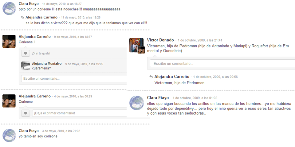 – Momentos también para recordar son los que nos han hecho pasar 2 de nuestros ex-compañeros… Con lo que nos gustan a ti y a mí las pelis cursis, de amor, americanadas totales o típicas de antena3 después de comer (aunque esas se le dan mejor a Bea), y que empeño le ponían Pilo y Víctor para que viéramos «cine bueno». Nunca en la vida se me olvidará cuando aceptamos ver EL PADRINO, y en la segunda película estábamos más perdidas que nada porque la habíamos empezado a la mitad, jajaja. Y las dos agobiadas porque no entendíamos quién era quién.