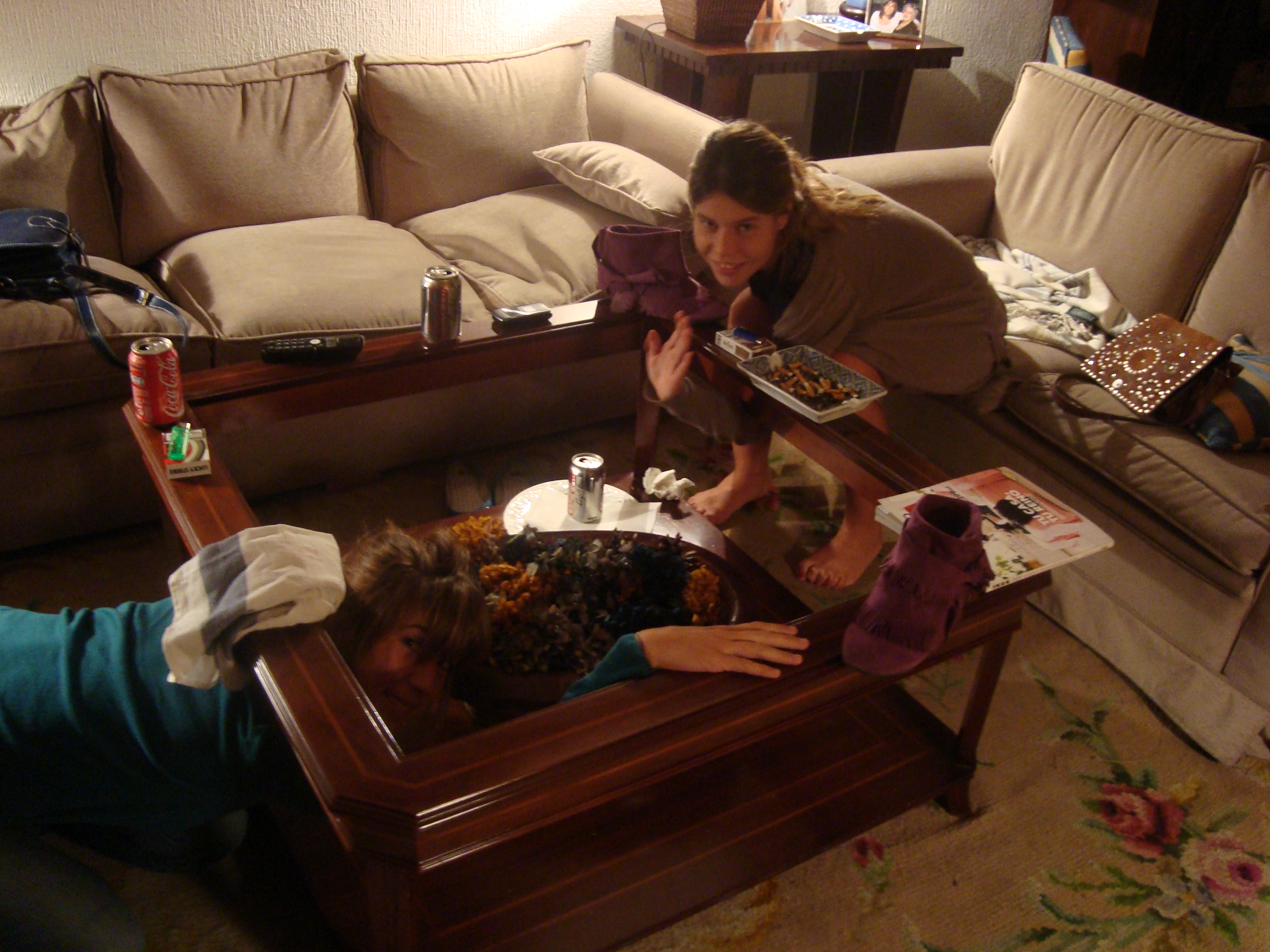 – La primera anécdota que me viene a la cabeza (por la cantidad de veces que lo hemos contado, por lo que nos hemos podido reír después y porque pasó cuando acababas de llegar) es la desaparición del cristal de la mesa del salón. Para quien no lo sepa, mi delgadísima y recientísima compañera de piso se enganchó con la alfombra y cayó hacia atrás, quedándose encajada en mitad de una mesa que tiene un cristal que obviamente se partió en mil pedazos debajo de ella. Gracias a Dios, a lo poco que pesa, y a que no estaba sola… apenas se hizo nada y pudo salir de ahí, aunque el susto no se lo quitaba nadie. Lo mejor de todo es que mientras ella lloraba angustiada por cómo me lo iba a decir y me esperaba, yo estaba de fiesta por ahí. Uno de esos días que dices «nada, hoy me tomo una copa y a casa». Sí sí… Creo que eran las 7am cuando entraba por la puerta y por cosas del destino, ya que normalmente voy directa a mi cuarto, ese día decidí ir al salón. Mis muchas copas de más y yo nos sentamos delante de la famosa mesa y lo único que pude pensar fue «Madre mía, qué mal voy que ni veo el cristal». Pocos minutos después me di cuenta de que no era yo, sino que realmente no había cristal!!! Clara se despertó, me contó todo, y como es de suponer, del propio susto digerí las copas del tirón!!! Lo que no se si sabías Clarita es que HAY FOTO de esa época, mientras esperábamos a que el seguro (que descubrí gracias a ti) nos trajera un cristal nuevo.