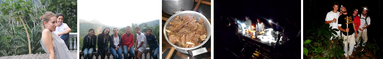 El domingo sin embargo nos esperaba una palicilla un poco mayor… Gabriela no se encontraba bien y decidió quedarse en el hotel esperándonos, y cuando estábamos empezando a adentrarnos un poco en el camino Pablo también decidió volver y quedarse en el hotel junto a Gabriela. El resto, y pese a que algunas como Mar y yo pensábamos que íbamos a morir ahogadas en las cuestas, nos pusimos en marcha por un camino bastante más largo y complicado que el día anterior. Santiago no paraba de contarnos anécdotas e historias sobre los árboles guineanos mientras Álvaro Torrente hacía fotos a absolutamente todo lo que se encontraba, Borja grababa, Carol y Jesús recogían hojas y frutos que se querían llevar de recuerdo… Tras bajar a resbalones, estuvimos un rato sentados delante de una cueva de murciélagos, y más tarde dejando las iniciales de la Fundación escritas en un árbol de un mirador. Nereida se hizo daño y Alviro y Jaime ejercieron de camilleros mientras Mar cantaba sin parar de vuelta al hotel. Haber resistido hasta el final fue un verdadero logro para nosotras.