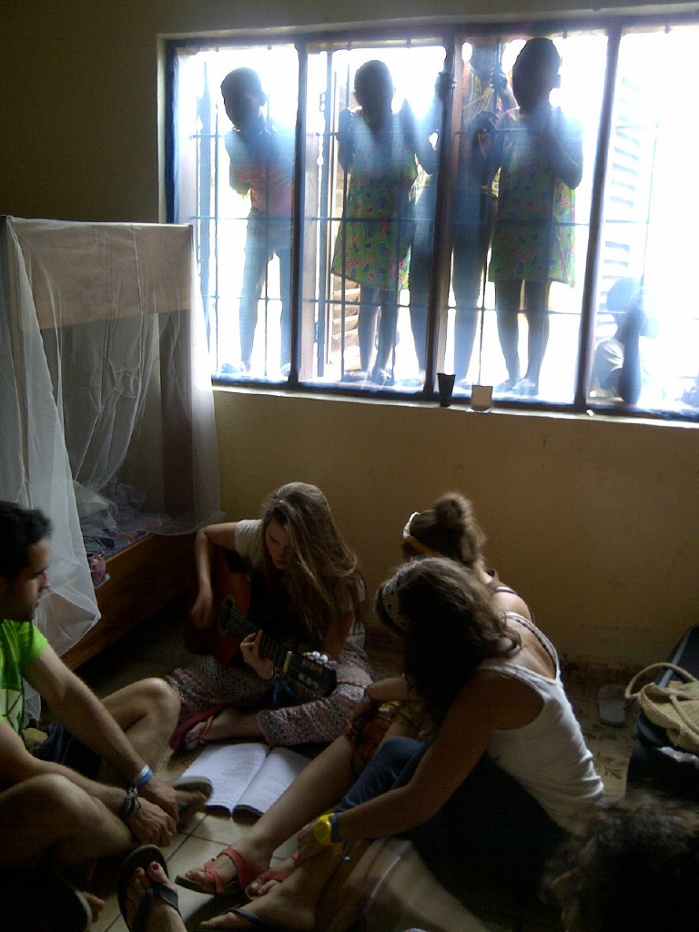 Ya con la distribución hecha, algunos aprovecharon para ducharse, otros para marcar territorio colgando de los árboles más cercanos la bandera de su ciudad, y otros nos sentamos a cantar alrededor de Paloma, que sacó por primera vez su guitarra y el cancionero, convirtiendo esos momentos en algo adictivo y que no puede faltar en cualquiera de nuestras reuniones. Los niños del cole, que no tenían permitida la entrada en el internado ni en nuestras habitaciones, se encaramaban a la ventana para poder disfrutar con nosotros.